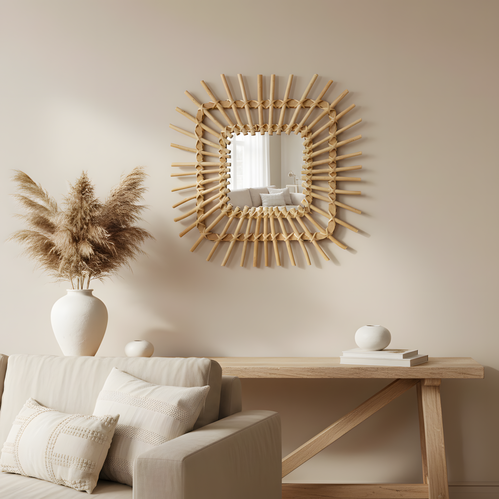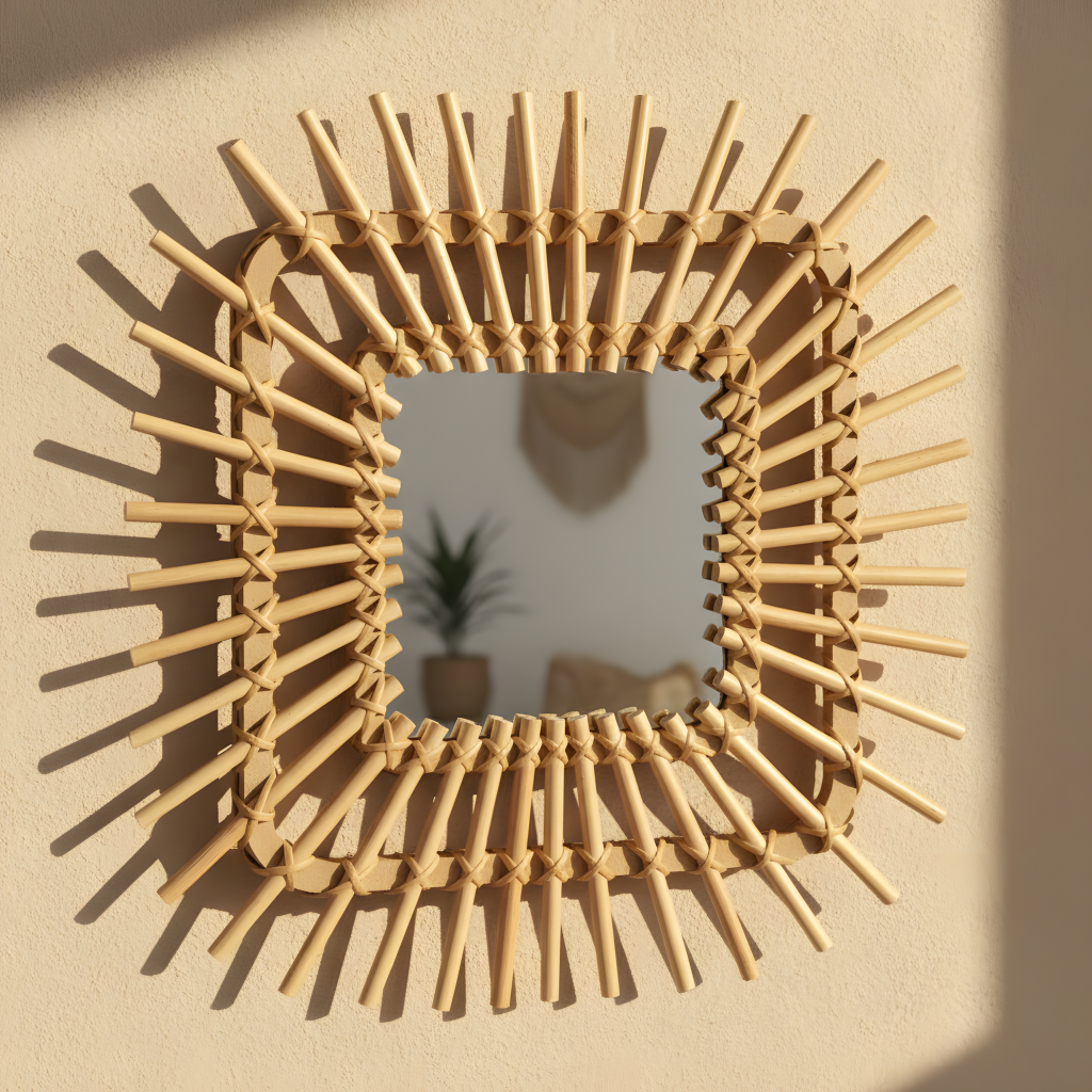 Dekorativní zrcadlo: minimalistický design, Boho styl Perfektní dekorace do předsíně, obývacího pokoje, koupelny, ložnice, altánu nebo terasy. Závěsné dekorativní slaměné ratanové zrcadlo, jemné a rustikální, poskytující jak funkční, tak dekorativní prvek.