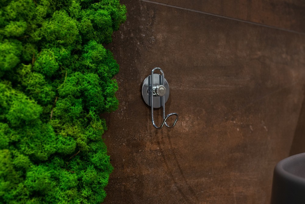 Nástěnný samolepící háček se snadno namontuje na 3M lepicí pásku. Jeho nosnost je až 4 kg. Má jeden široký háček na zavěšení.