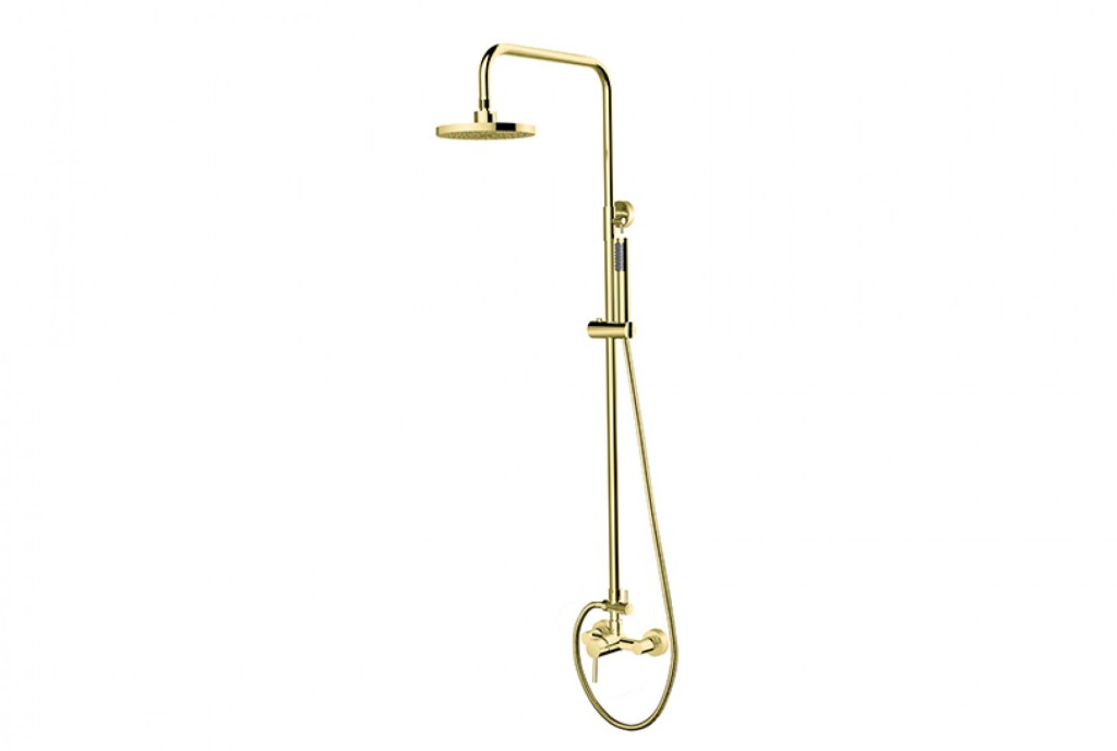Jedinečný nástěnný sprchový set s příslušenstvím DECCO/ILLUSION v zlaté barvě s elegantními zaoblenými tvary.