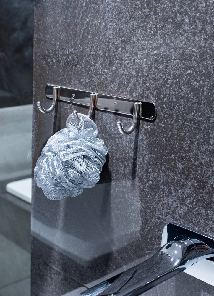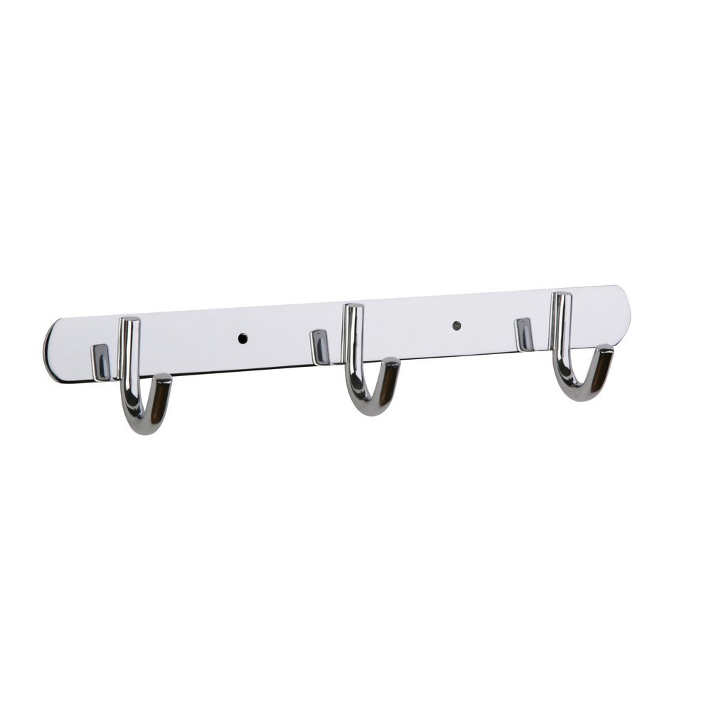 Univerzální, trojitý koupelnový věšák z nerezové oceli. Nástěnný věšák se montuje pomocí dvou šroubů a hmoždinek, které jsou součástí balení.