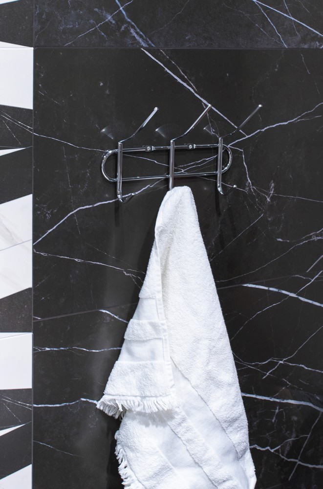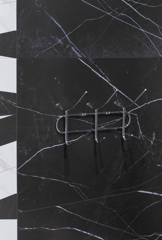 Nástěnný věšák vyrobený z chromovaného ocelového drátu. Má tři spodní háčky a tři horní háčky.