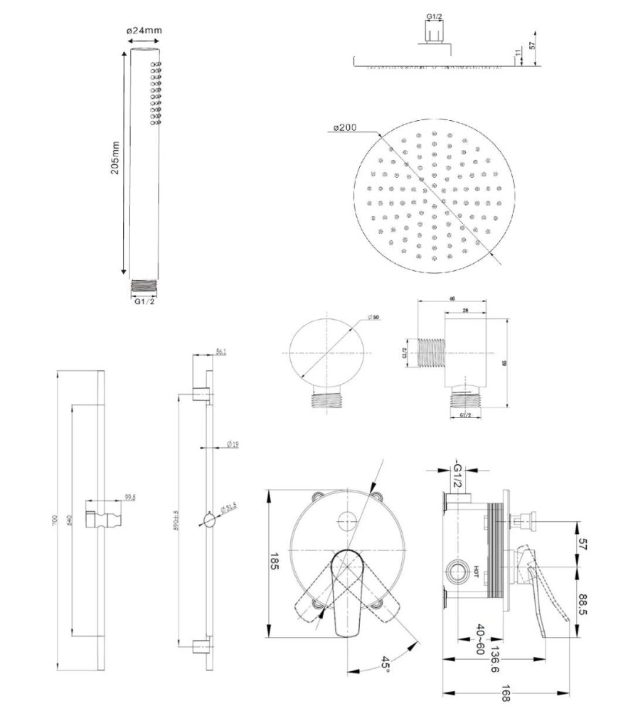 horní sprchu 200 mm se sprchovým ramenem 350 mm
