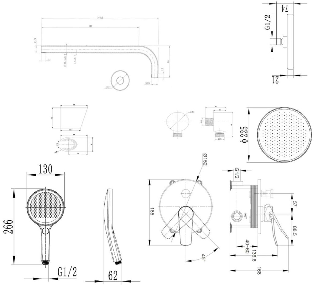 horní sprchu 225 mm se sprchovým ramenem 350 mm