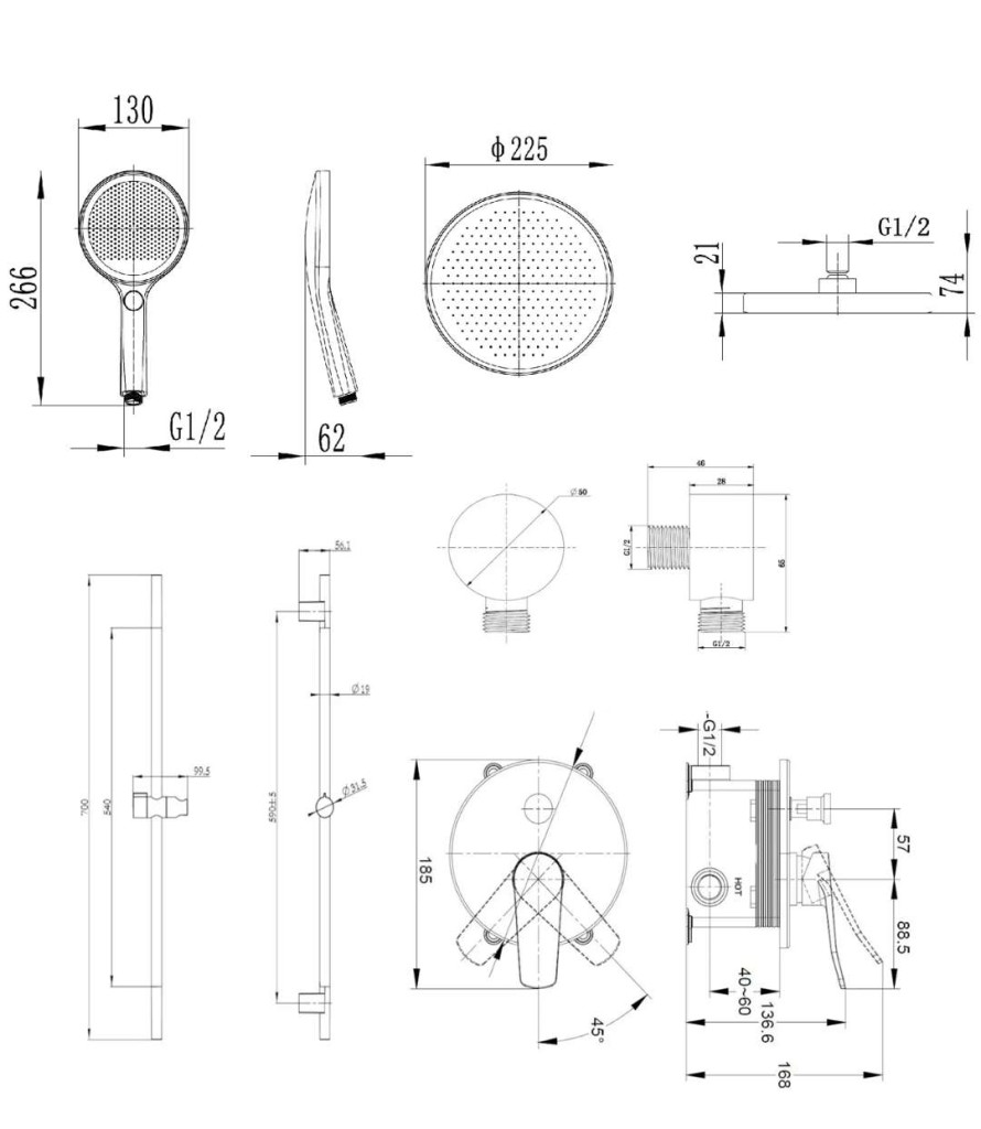horní sprchu 225 mm se sprchovým ramenem 350 mm