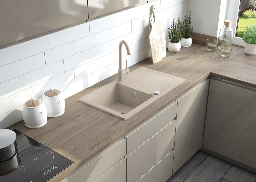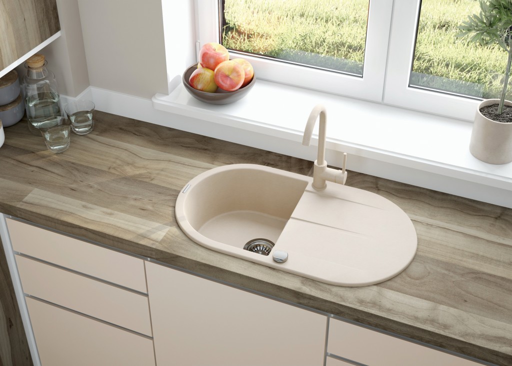 Stojánková dřezová baterie Nemezja s výtokem ve tvaru U v elegantním alabastrovém provedení je perfektním řešením pro moderní, světlé, minimalistické kuchyně. Tato baterie se vyznačuje vysokým, zaobleným výtokem typu U, pohodlnou pákou umístěnou na boku a perlátorem, který proud provzdušňuje. Béžová dřezová baterie z kolekce Nemezja bude nejlépe vypadat v kombinaci se světlým granitovým dřezem a světlou nebo tmavou pracovní deskou.