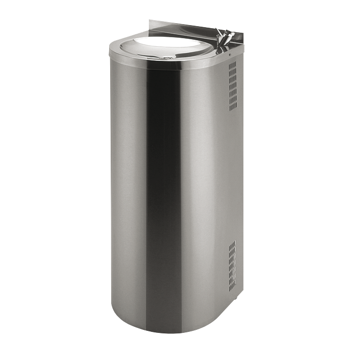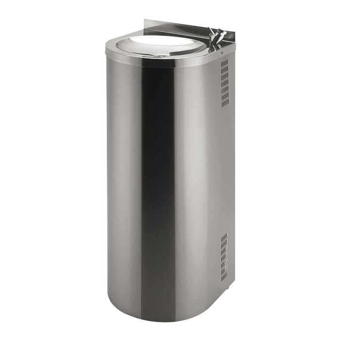 Nerezová pitná fontána určená k montáži ke stěně, s tlačnou pitnou armaturou