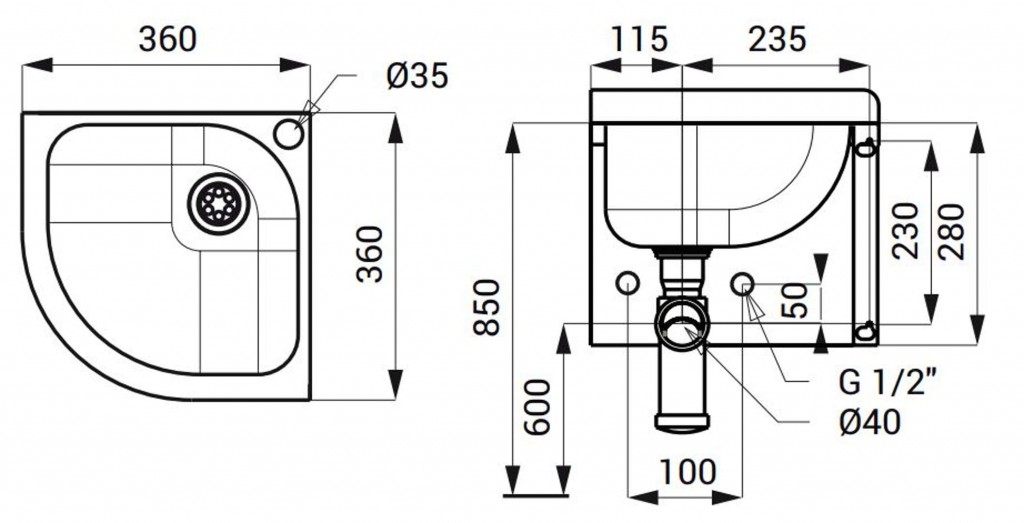 Nerezové rohové umyvadlo SLUN 11, bez přepadu
