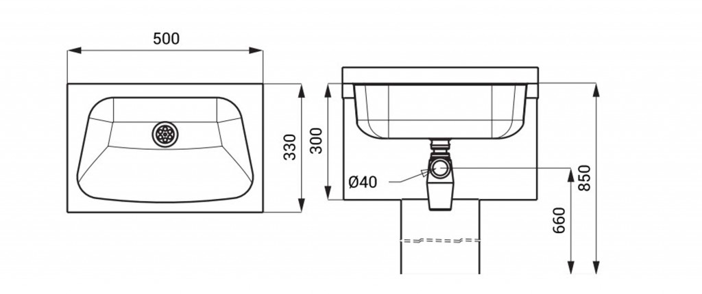Samonosné nerezové umyvadlo SLUN 57 s opláštěním ke stěně, bez přepadu