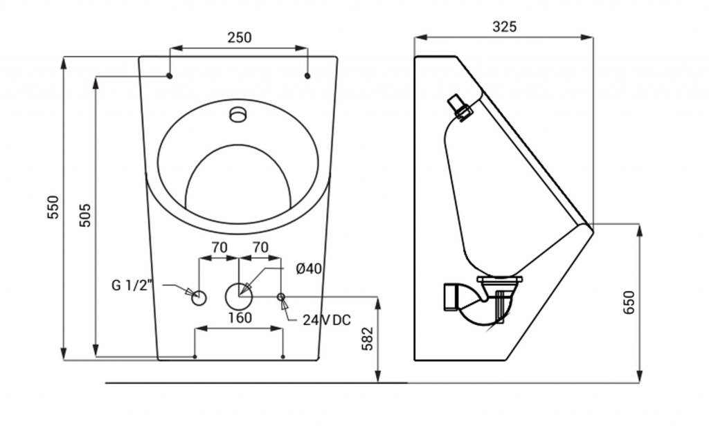 nerezový pisoár se sprchovou hlavicí, elektronika, elektromagnetický ventil (1 ks), propojovací hadice, rohový ventil, sifon, úchytová sada, 9V lithiová napájecí baterie