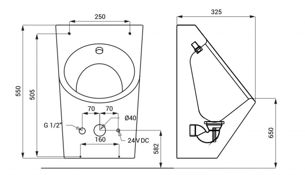 nerezový pisoár se servisním otvorem, skryté splachování, elektromagnetický ventil, rohový ventil, propojovací hadice, sifon, úchytová sada