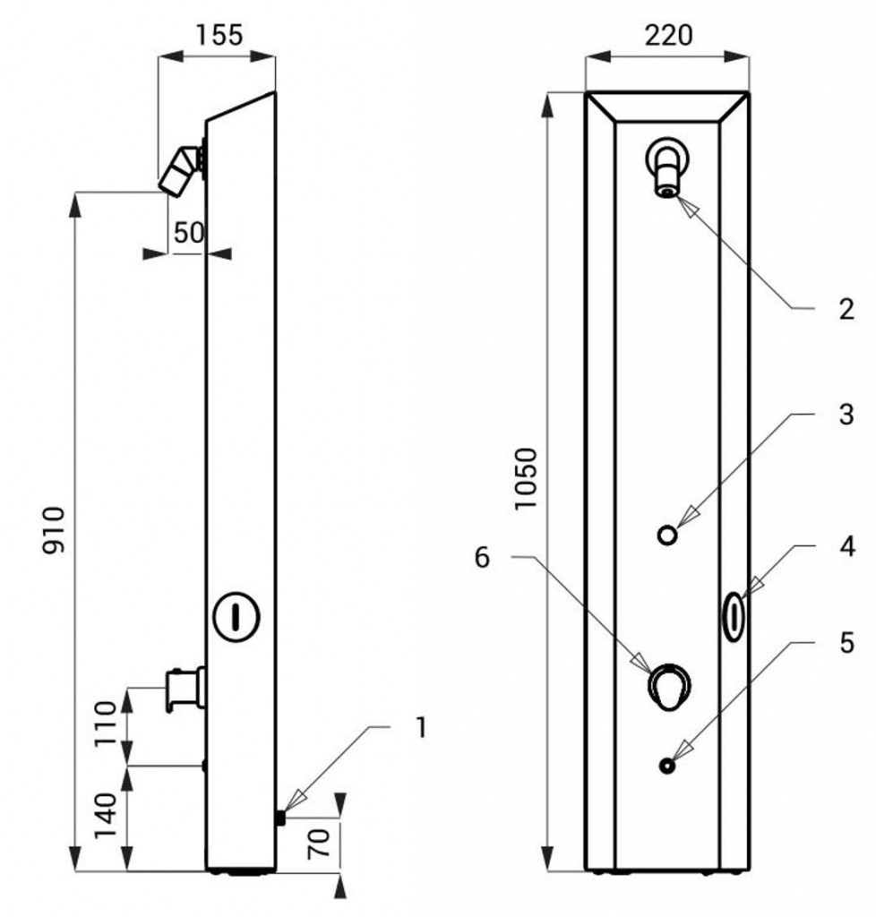 - sprchový panel s elektronikou a zásobníkem na žetony, sprchová hlavice s nastavením úhlu výtoku