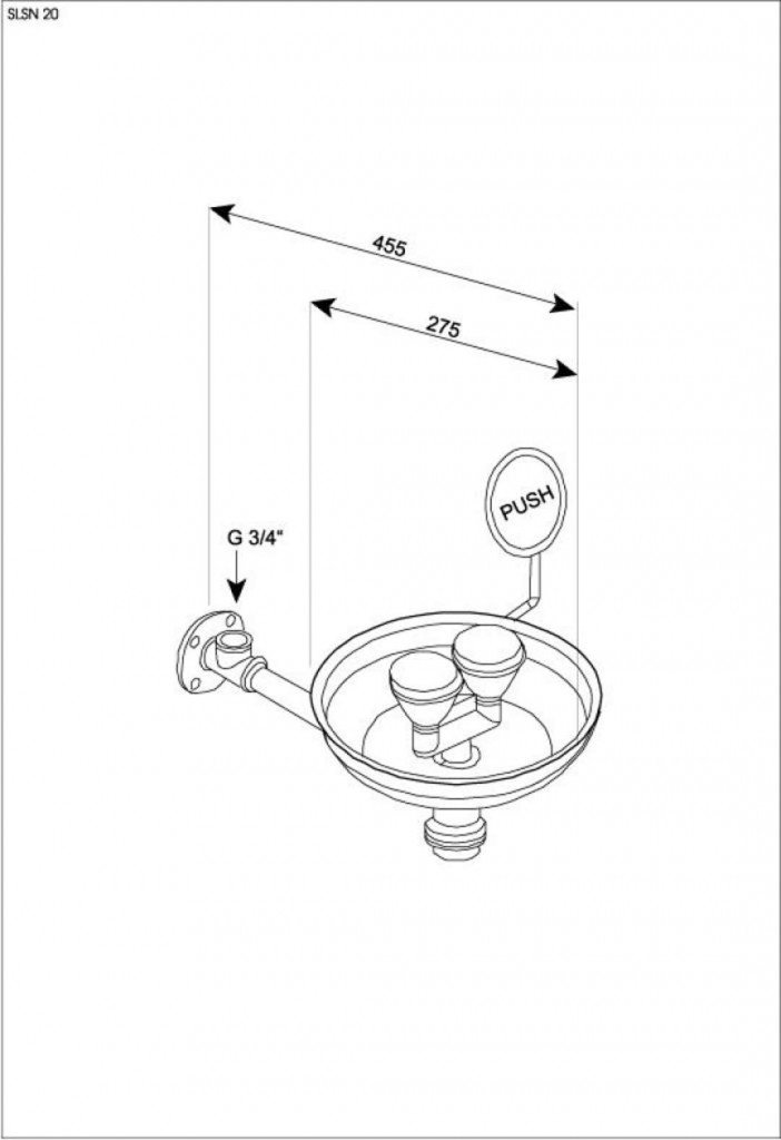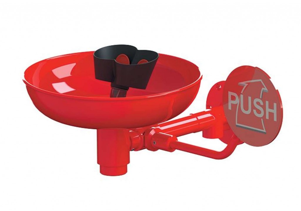 - nástěnná oční sprcha se dvěma hlavicemi, spouštěcí pákou a miskou