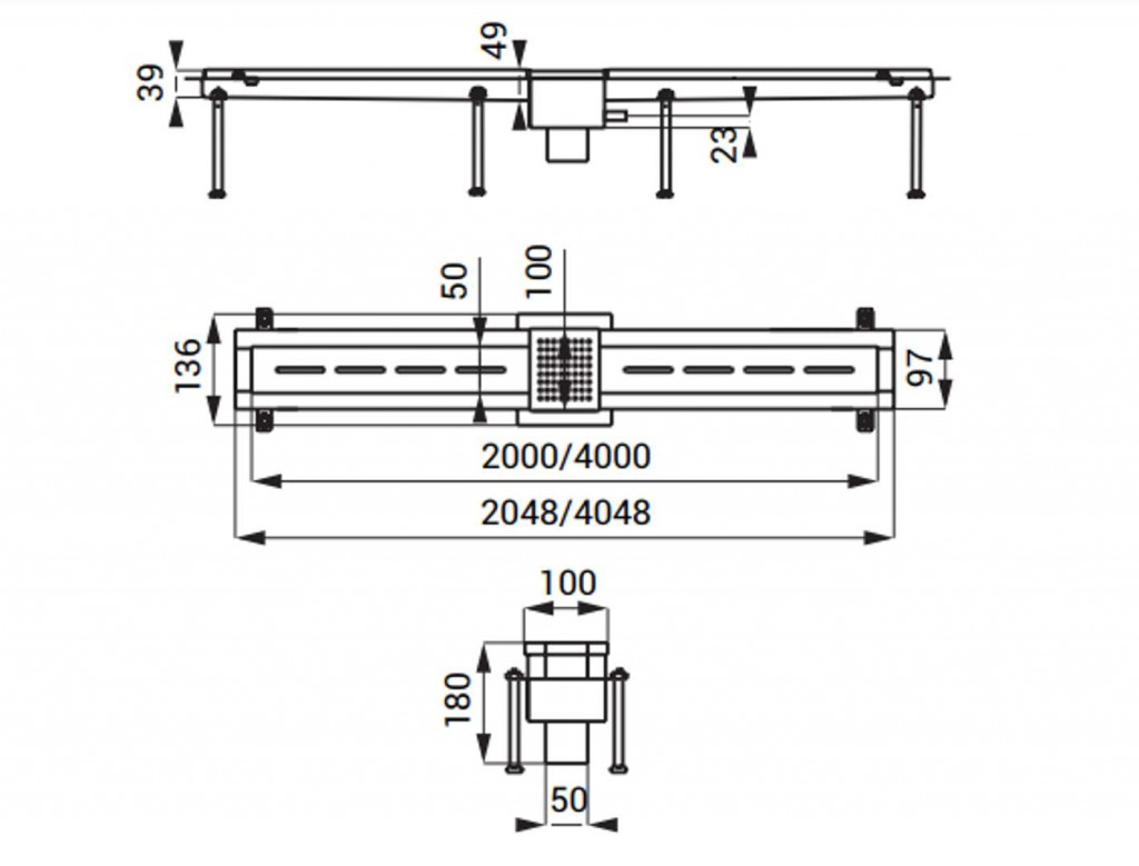 žlábek (2 m, AISI-316L), vpusť se zápachovou uzávěrou, krycí rošt, pracny