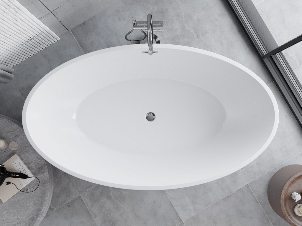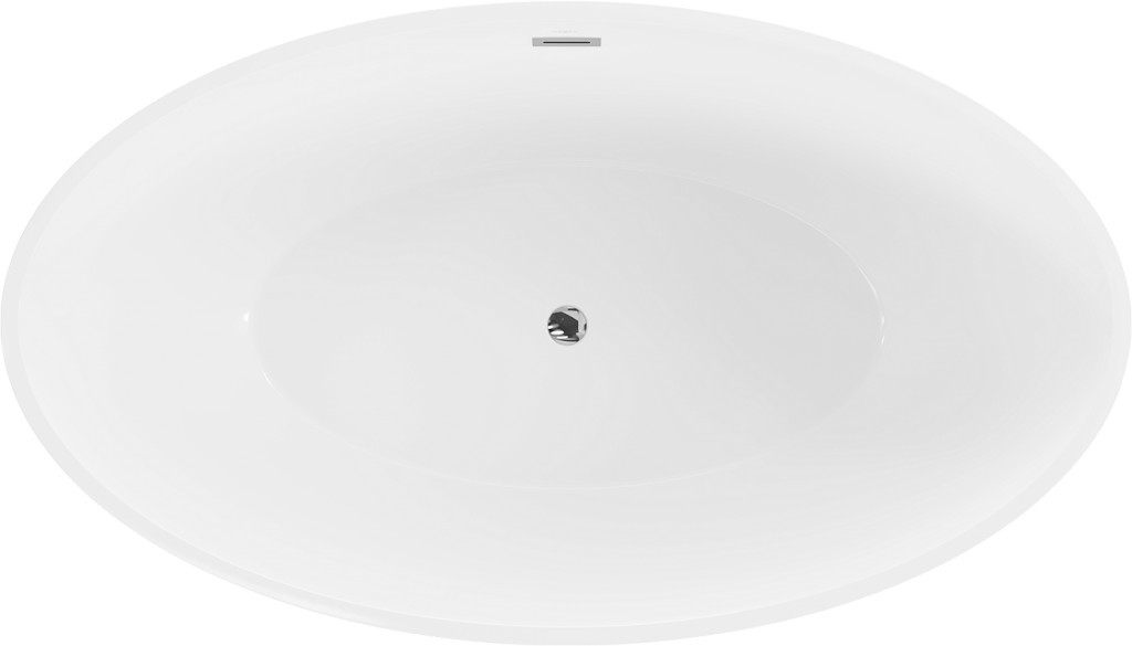 Volně stojící oválná akrylátová vana série Nike od výrobce MEXEN s přepadem a umístěném odpadu na středu vany.