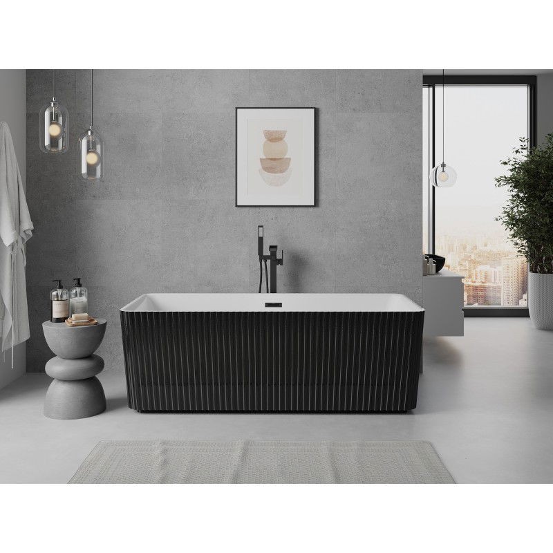 Specifikace produktu: Rozměry: 170 x 75 cm Výška: 58 cm Hloubka: 45 cm Instalace: Volně stojící Materiál: Sanitární akrylát Barva: Bílá/Černá Povrchová úprava: Černá Struktura: Drážkovaná Otvor pro přepad: Ano Otvor pro baterii: Ne Sifon a zátka click-clack jsou součástí dodávky Odolné vůči baterii, baterii a UV záření