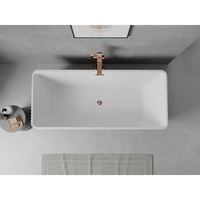 Specifikace produktu: Rozměry: 170 x 75 cm Výška: 58 cm Hloubka: 45 cm Instalace: Volně stojící Materiál: Sanitární akrylát Barva: Bílá/Černá Povrchová úprava: Růžové zlato Konstrukce: Drážkovaná Otvor pro přepad: Ano Otvor pro baterii: Ne Sifon a zátka click-clack jsou součástí balení Odolné vůči baterii a UV záření
