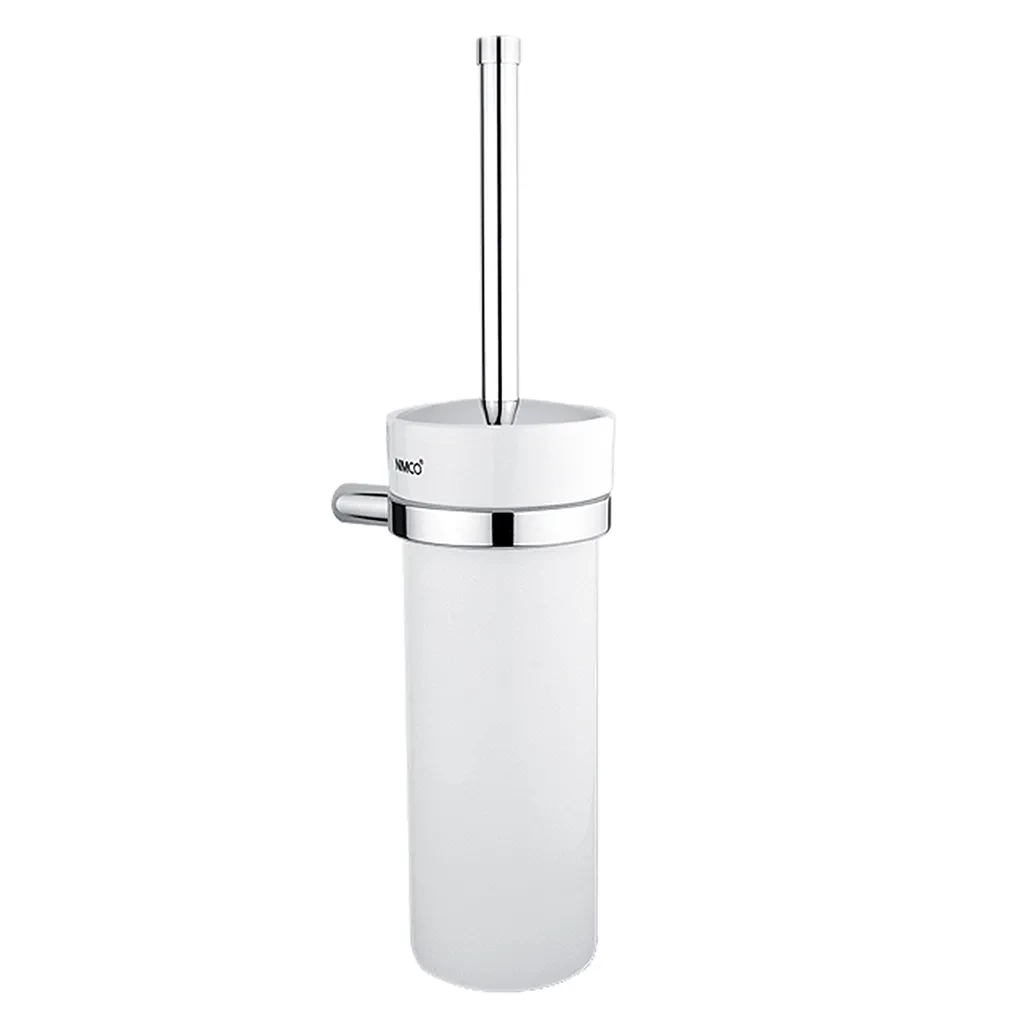 Toaletní WC kartáč s nádobkou z keramiky. Rukojeť kartáče z mosazi s povrchovou úpravou chrom.