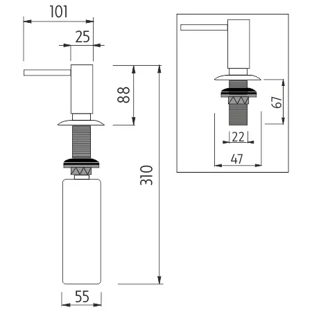 Umyvadla v koupelnách a dřezy v kuchyních jsou jednoznačně nejpoužívanějšími zařízeními vašeho obydlí. Čas i práci Vám ušetří vestavěný dávkovač na tekuté mýdlo, dezinfekční gel nebo prostředku na mytí nádobí. Plastová nádobka na mýdlo má obsah 350ml. Je možné dokoupit k dávkovači nádobku 1000ml ( označení 1029VA-XL). Plnění nádobky je shora vyjmutím dávkovací pumpy. Pumpa je mosazná s povrchovou úpravou chrom, závit je z vysoce kvalitního plastu POM. Hlava pumpy průměr 25mm. Výška desky pro vyvrtání otvoru max 52mm. Délka závitu 67mm. Průměr závitu 22mm. Max. otvor pro vyvrtání 35mm. 1 dávka pr.1ml(max až 2,5ml).