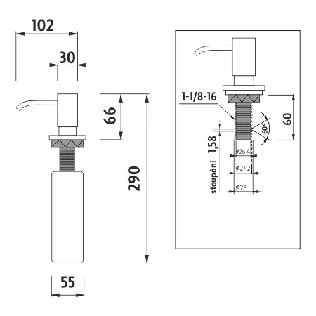 Umyvadla v koupelnách a dřezy v kuchyních jsou jednoznačně nejpoužívanějšími zařízeními vašeho obydlí. Čas i práci Vám ušetří vestavěný dávkovač na tekuté mýdlo, dezinfekčního gelu nebo prostředku na mytí nádobí. Plastová nádobka na mýdlo má obsah 350ml. Je možné dokoupit k dávkovači nádobku 1000ml ( označení 1029VN-XL). Plnění nádobky je shora vyjmutím dávkovací pumpy. Pumpa je mosazná s povrchovou úpravou chrom, závit je z vysoce kvalitního plastu POM. Hlava pumpy průměr 30mm. Optimální výška desky 40-50mm. Výška závitu 60mm. Průměr závitu 28mm. Průměr otvoru pro vyvrtání pro vestavěný dávkovač je 29-38mm.