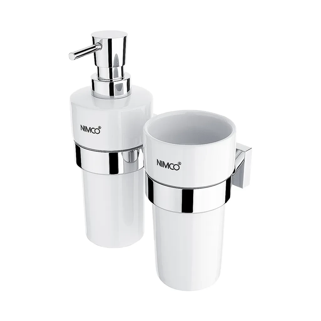 Držák pohárku a dávkovače. Nádobky keramické. Objem 300 ml. Pumpička mosaz s povrchovou úpravou chrom.