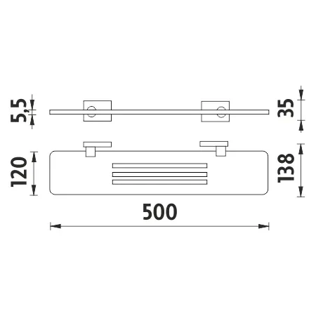 Police plexiglass s frézovanými otvory. Úchyty mosaz / chrom. Délka 50 cm.