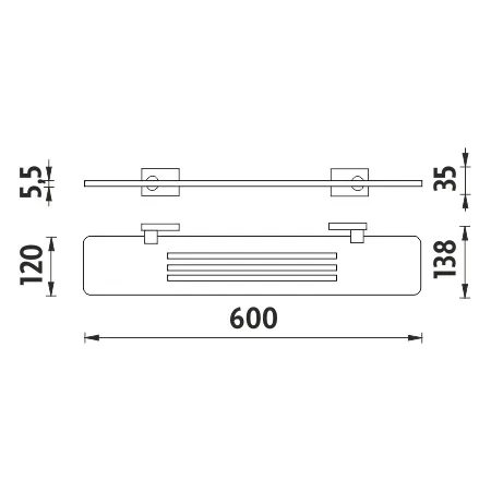 Police plexiglass s frézovanými otvory. Úchyty mosaz / chrom. Délka 60 cm.