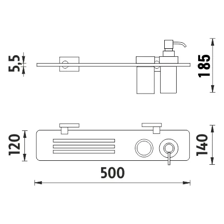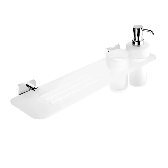 Police plexiglass s frézovanými otvory s mat. sklenkou a dávkovačem, 250 ml. Úchyty mosaz / chrom. Délka 50 cm.