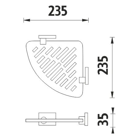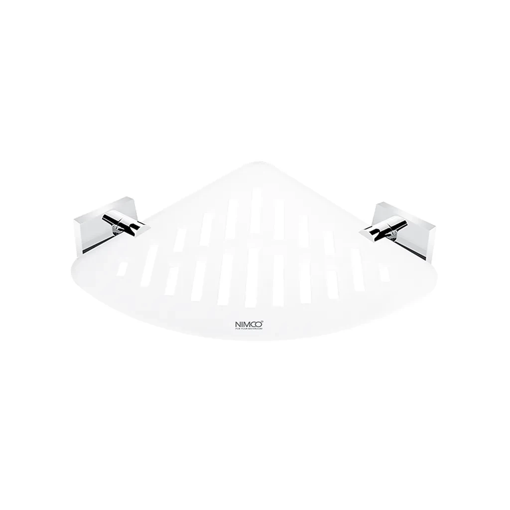 Rohová polička plexiglass s frézováním. Úchyty mosaz / chrom. Rozměr 23,5x23,5 cm.