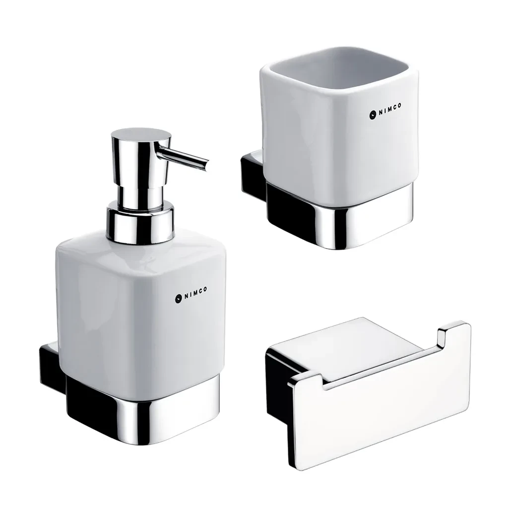 Nimco Kibo chrom sada k umyvadlu, dávkovač mýdla, držák zubních kartáčků, háček na ručník Ki set-31K-26 Sada keramických nástěnných koupelnových doplňků - dávkovač mýdla, držák kartáčků, háček na ručník je skvělým doplňkem do koupelny. Tato sada koupelnových doplňků obsahuje následující výrobky NIMCO ze série KIBO: Dávkovač tekutého mýdla Ki 14031K-26 Dávkovač na tekuté mýdlo o objemu 320 ml. Nádobka keramická. Pumpička plast / chrom. 1 ks. Držák na kartáčky Ki 14058K-26 Nástěnný držák s keramickým pohárkem na kartáčky. 1 ks. Dvojitý háček na ručníky Ki 14053-26 Designový dvojitý háček na ručníky, župany apod. Pochromovaná mosaz 1 ks. BARVA / ÚPRAVA: chrom MATERIÁL: pochromovaná mosaz MONTÁŽ A UMÍSTĚNÍ: Nástěnné - vrtání