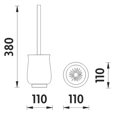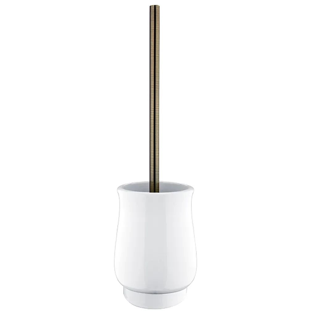 Keramický volně stojící WC kartáč. Rukojeť kartáče kovová. Povrchová úprava rukojeti staromosaz.