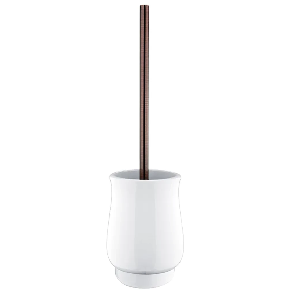 Keramický volně stojící WC kartáč. Rukojeť kartáče kovová. Povrchová úprava rukojeti staroměď.