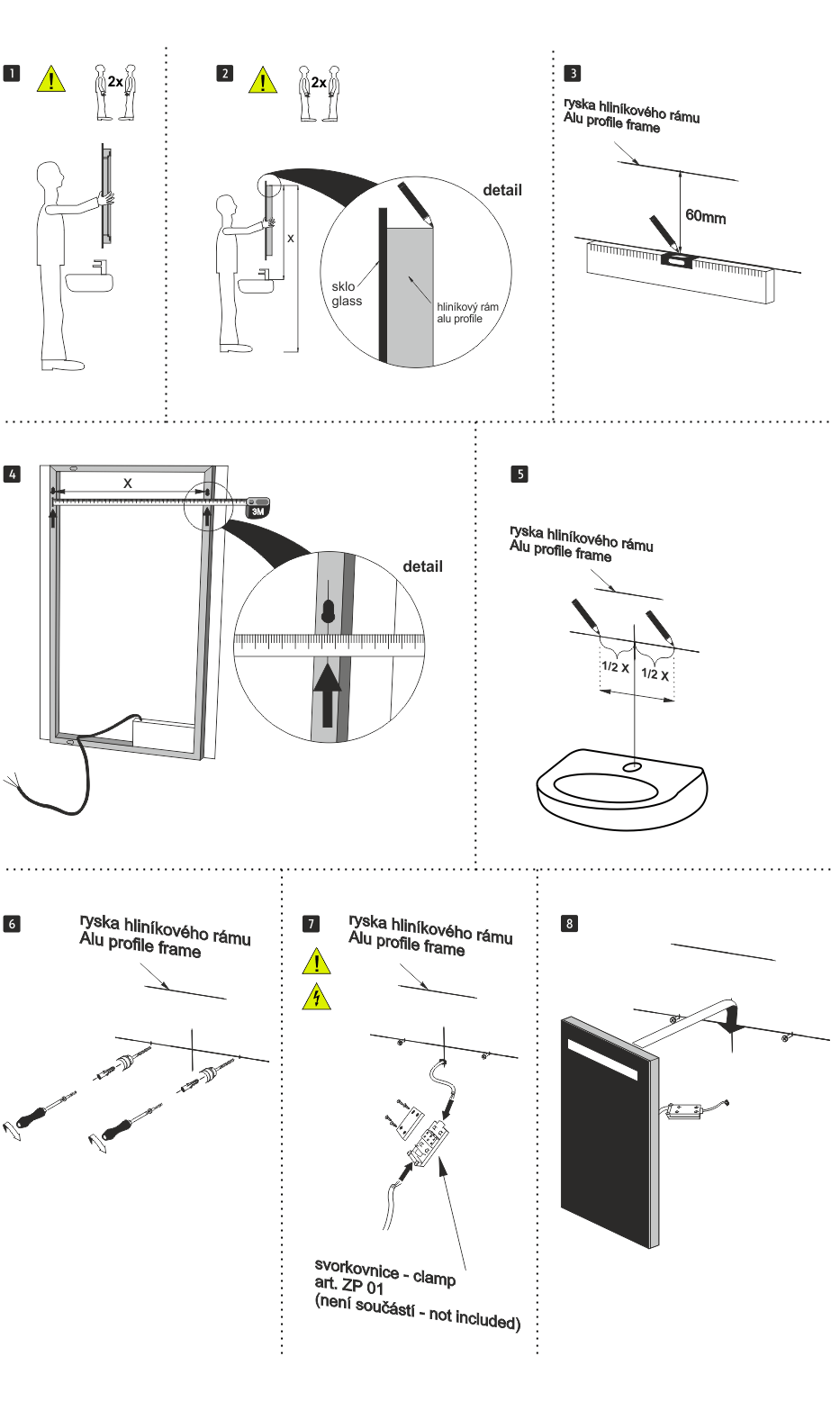 Nová technologie svícení za použití akrylátového skla – plexiglass. Konstrukce je z hliníkového rámu 32x19 mm, sklo zrcadla o tloušťce 5mm. Zrcadlo lze uchytit horizontálně a vertikálně. Připojení 220-240 V. Ochrana IP 44. Bez vypínače. Zapojení do el. rozvodu a zapínání přes vypínač světel v místnosti. LED čipy s vysokým výkonem. Barevná Teplota denní bílá – jasné polední světlo. Životnost LED diod je až 50 000 hodin.