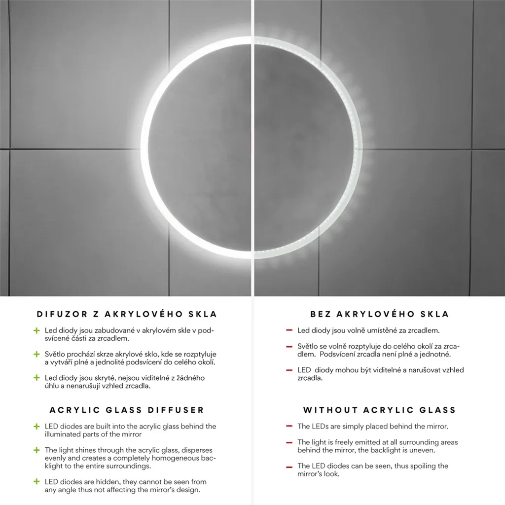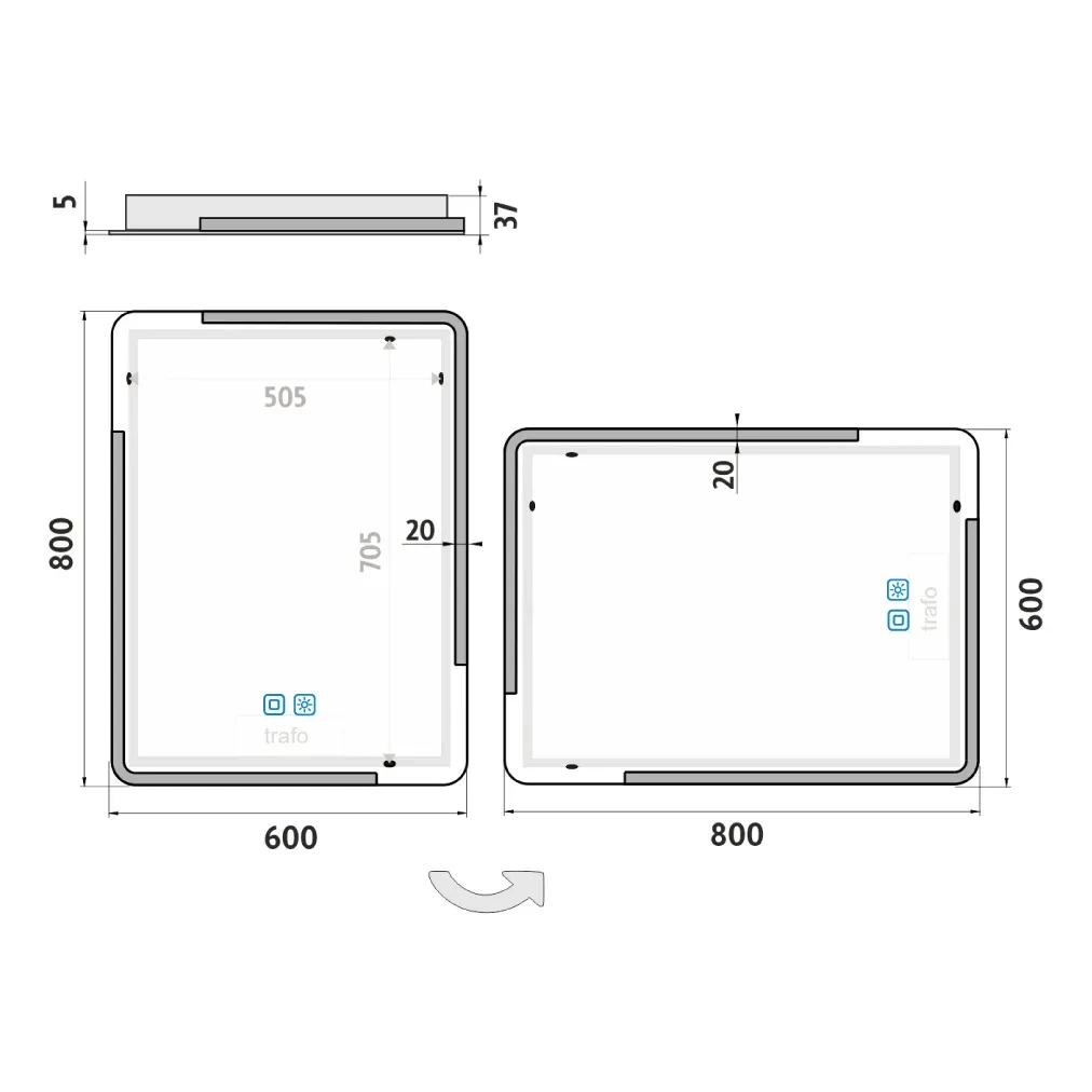 Nimco zrcadlo LED 600 x 800 Model 15000 hliníkový rám ZP 15002V Koupelnové podsvícené LED zrcadlo. Možnost nastavení teploty svítivosti od 2700 - 6000 K. Výkon 32 W. 2304 Lumen. Nová technologie svícení za použití akrylátového skla – plexiglass. Konstrukce je z hliníkového rámu 32x19 mm, sklo zrcadla o tloušťce 5mm. Připojení 220-240 V. Zapínání / vypínání / ovládání dotykovým senzorem s pamětí. Možnost nastavení barevné teploty svícení. Životnost LED diod je až 50 000 hodin. Ochrana IP 44.