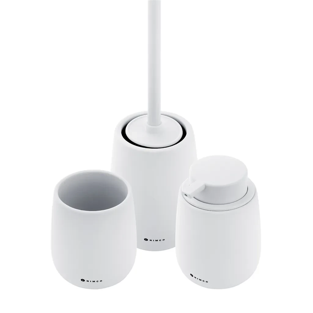 Sada doplňků do koupelny a WC obsahuje dávkovač tekutého mýdla, pohárek na zubní kartáčky a WC kartáč. Nádobky keramické bílé matné. "Soft-touch" povrch. Speciální dodatečná povrchová úprava. Povrch je hebký, příjemný na dotek.