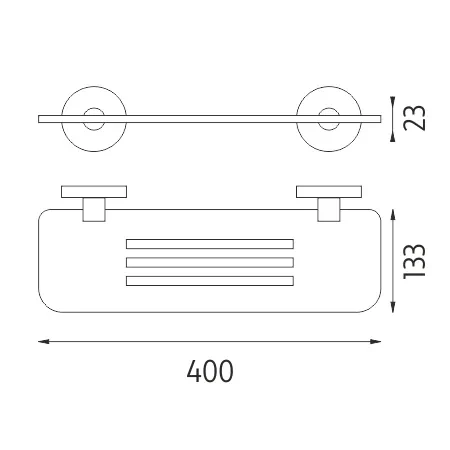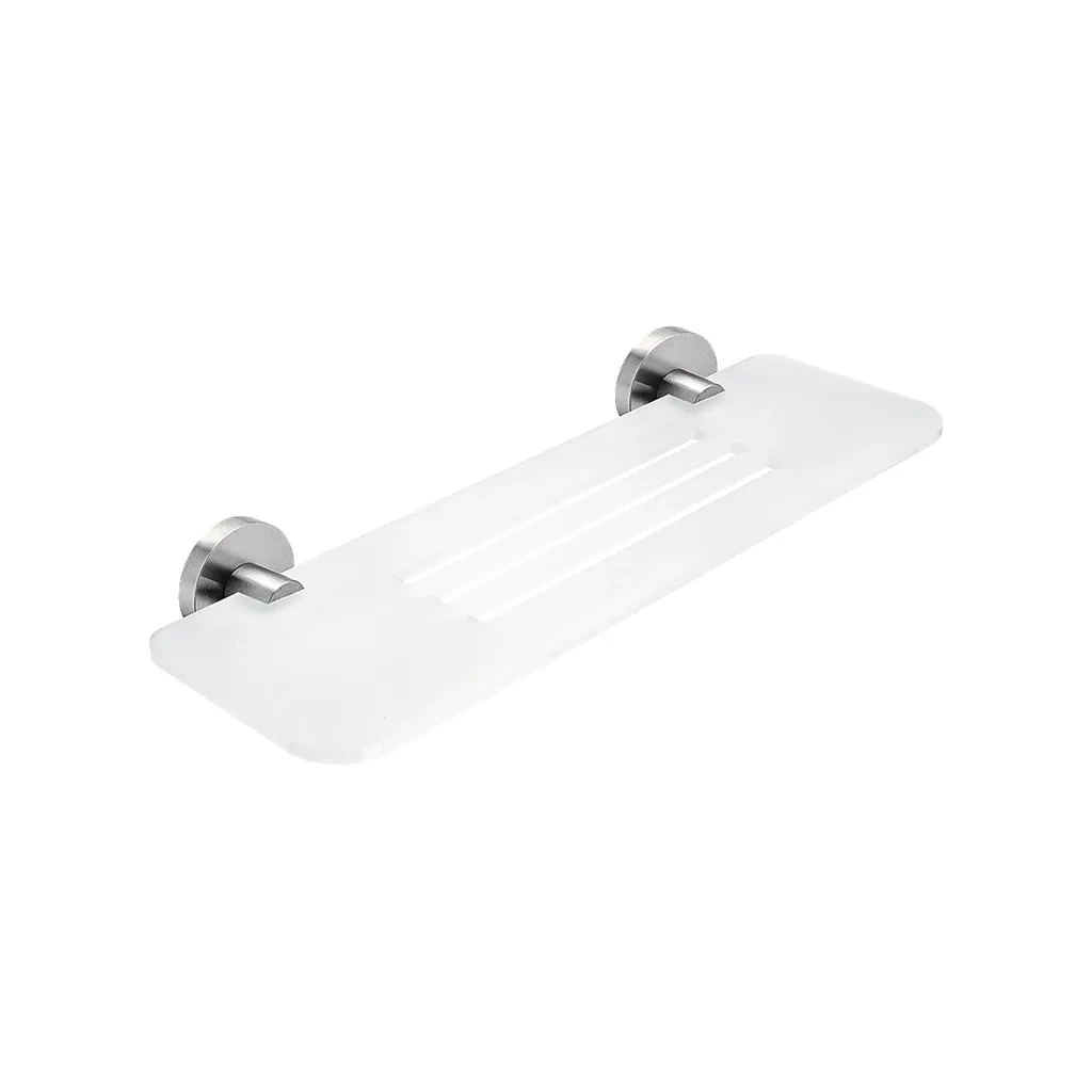 Police s frézovanými otvory. Materiál plexiglass s matovaným povrchem. Délka 40 cm. Úchyty broušená nerez.