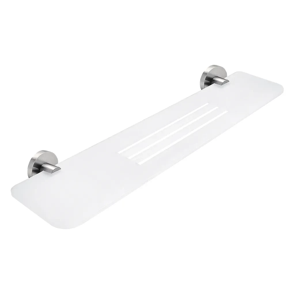 Police s frézovanými otvory. Materiál plexiglass s matovaným povrchem. Délka 60 cm. Úchyty broušená nerez.