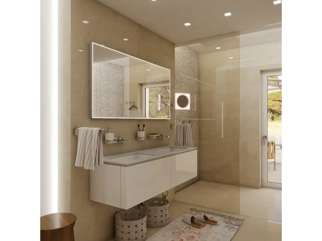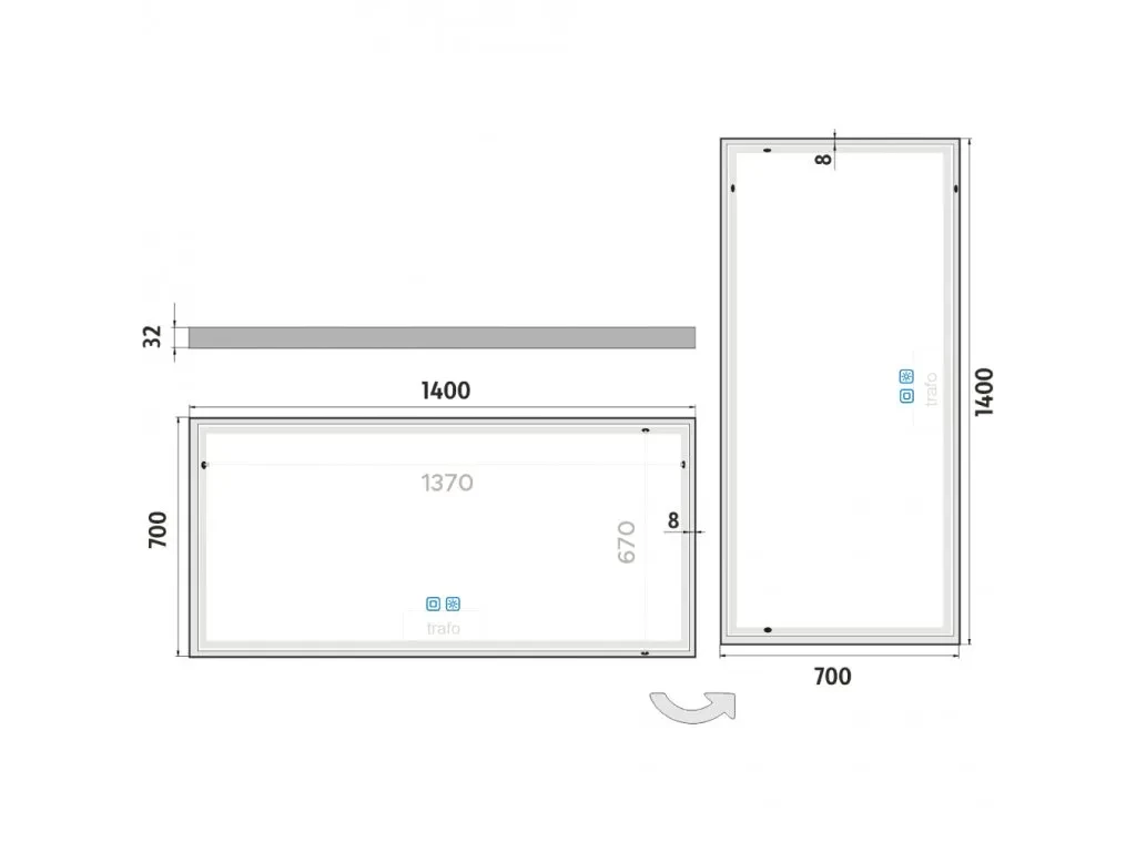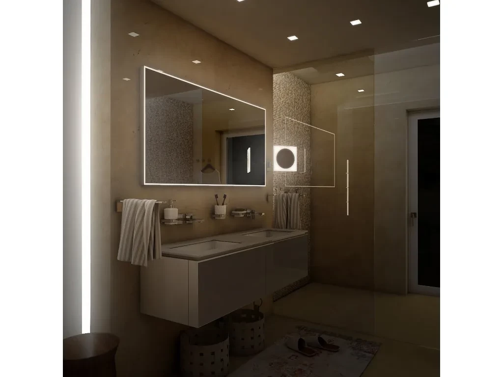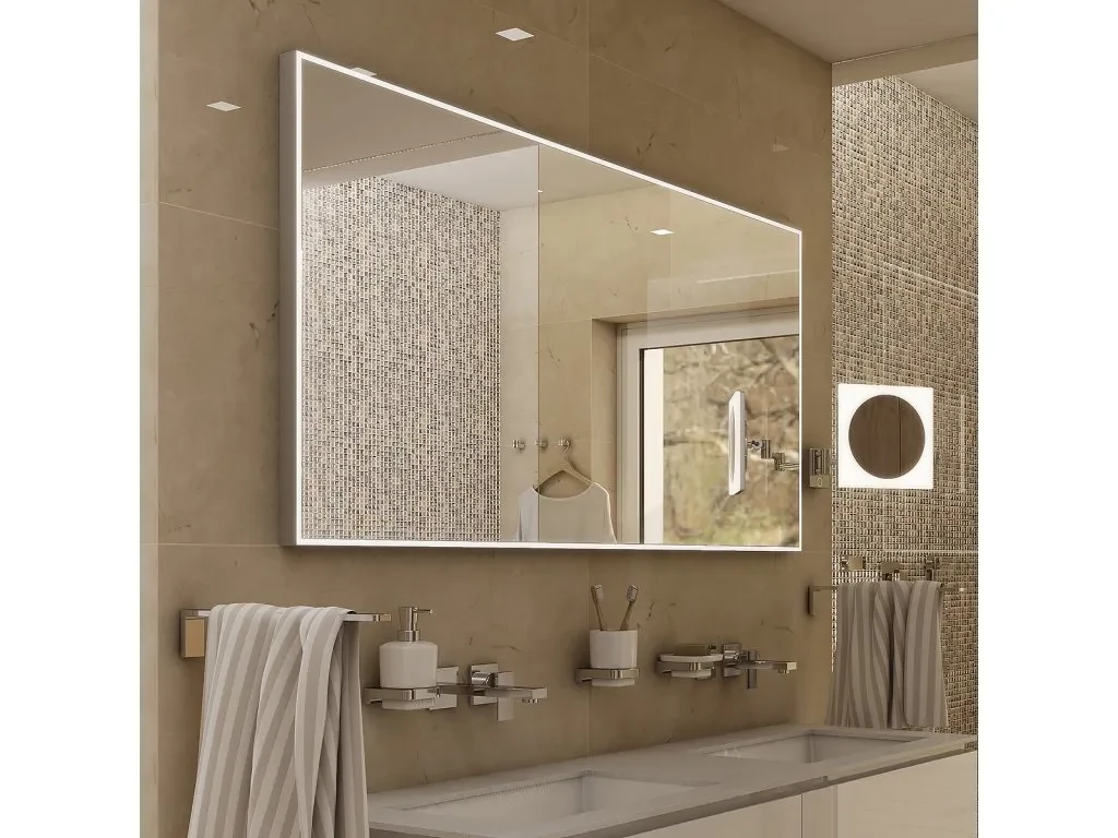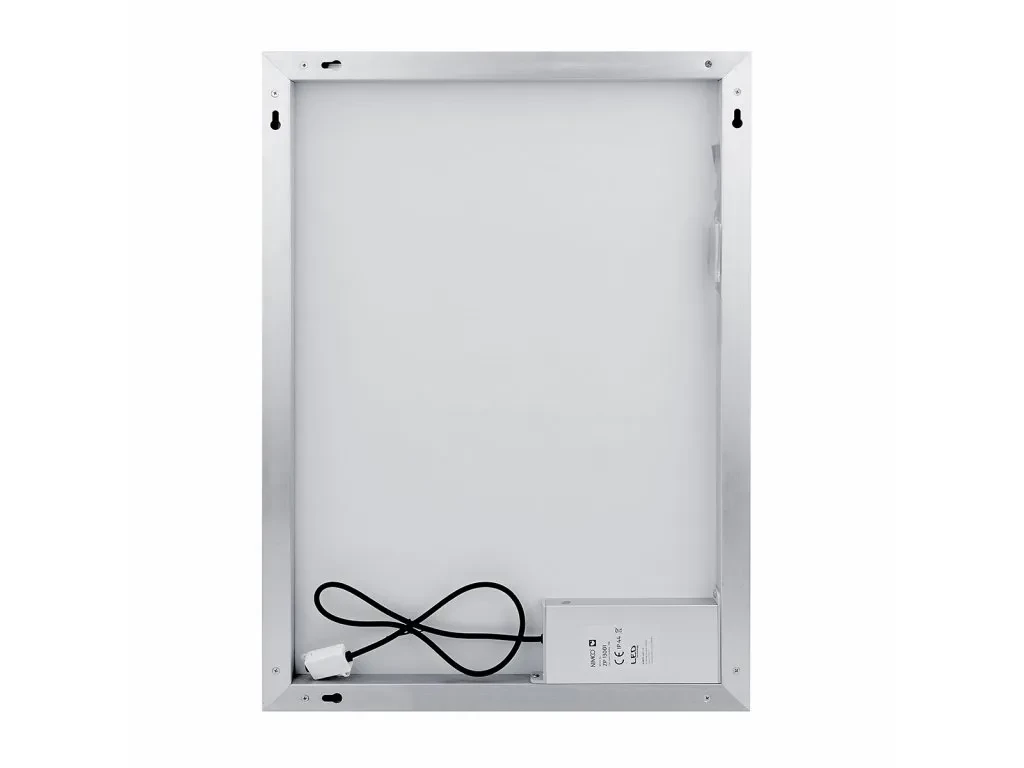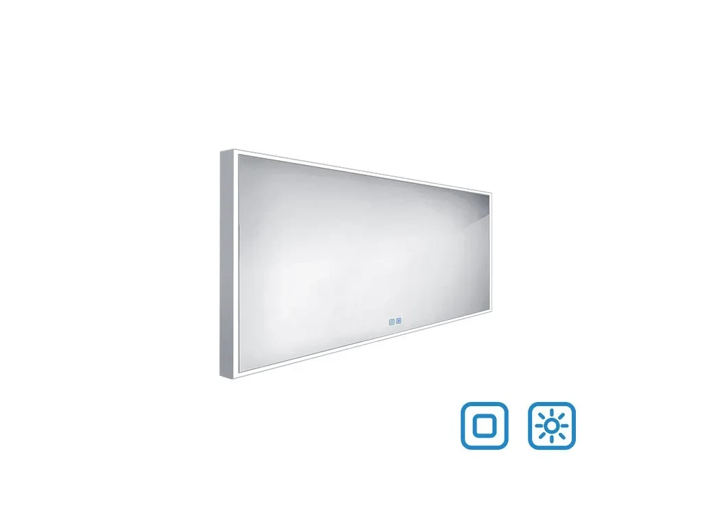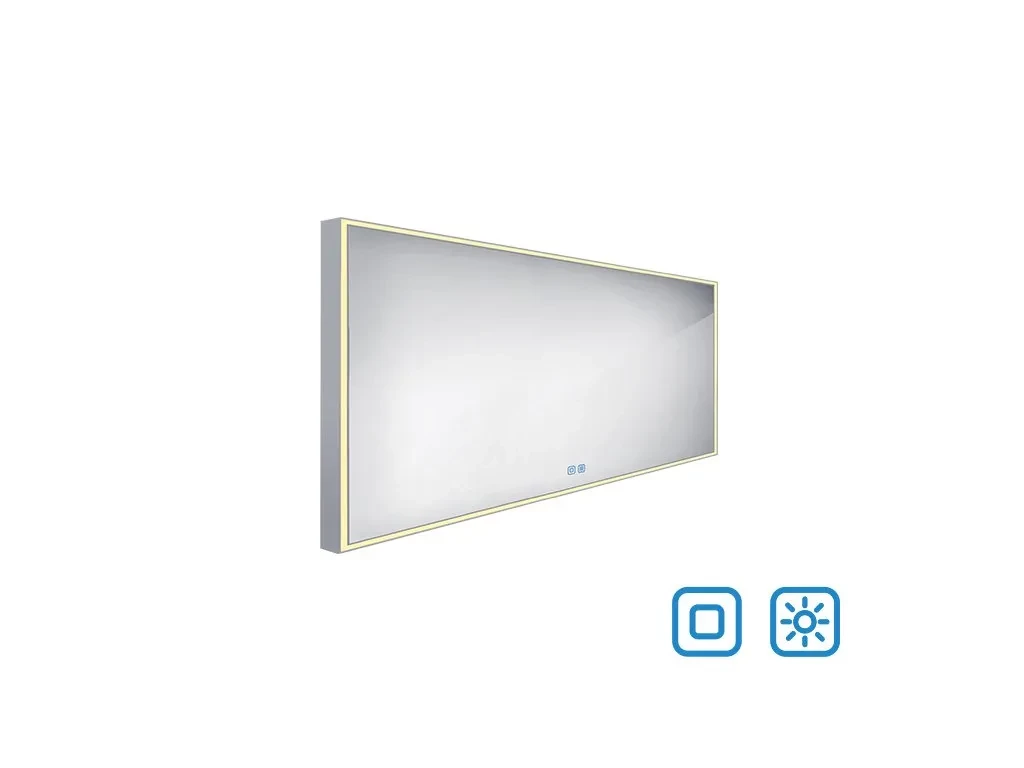 Velké zrcadlo do koupelny 140x70 cm s osvětlením v tenkém rámu po obvodu, dotykový spínač je skvělým doplňkem do koupelny. Zrcadla do koupelny NIMCO vynikají kvalitním zpracováním a moderním designem. Osvětlení zajišťují výkonné LED diody po celém obvodu zrcadla zakryté 8 mm rámečkem. Konstrukce z hliníkového rámu 32x19 mm, sklo zrcadla o tloušťce 5 mm. Připojení 220-240 V. Zapínání / vypínání / ovládání dotykovým senzorem. Možnost nastavení barevné teploty svícení a intenzity svítivosti. Životnost LED diod je až 50 000 hodin. Ochrana IP 44. Součástí zrcadla je kabelová spojka, IP 44. Příkon 60 W Možnost nastavení barevné teploty od 3000 - 6500 K Možnost nastavení intenzity svítivosti Zrcadlo má paměť, pamatuje si poslední nastavené hodnoty První možnost připojení přímo do elektrického obvodu Druhá možnost zapojení zrcadla na klasický kolébkový vypínač v koupelně podobně jako i jiná svítidla 4320 Lumen