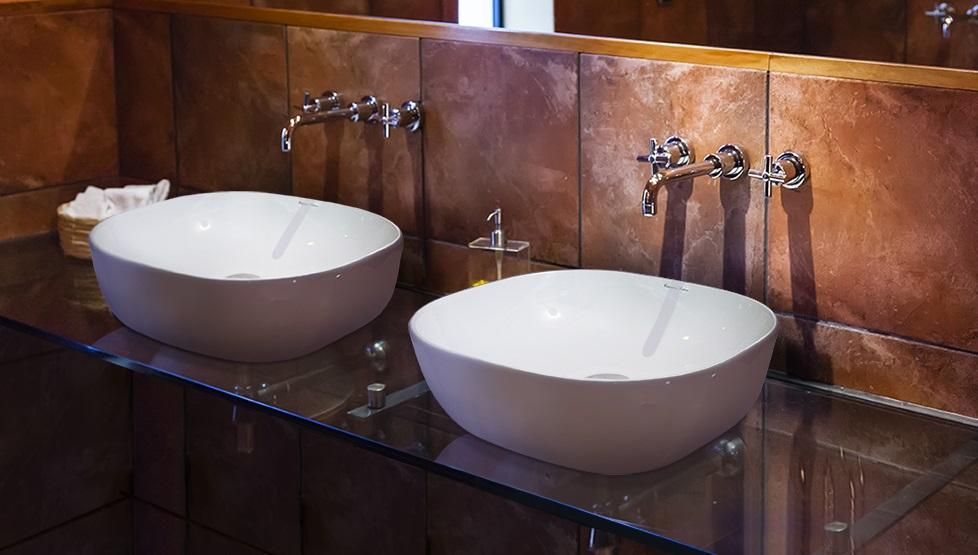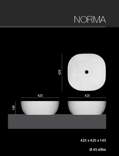 Keramické umyvadlo se zaoblenými rohy bez otvoru pro baterii.