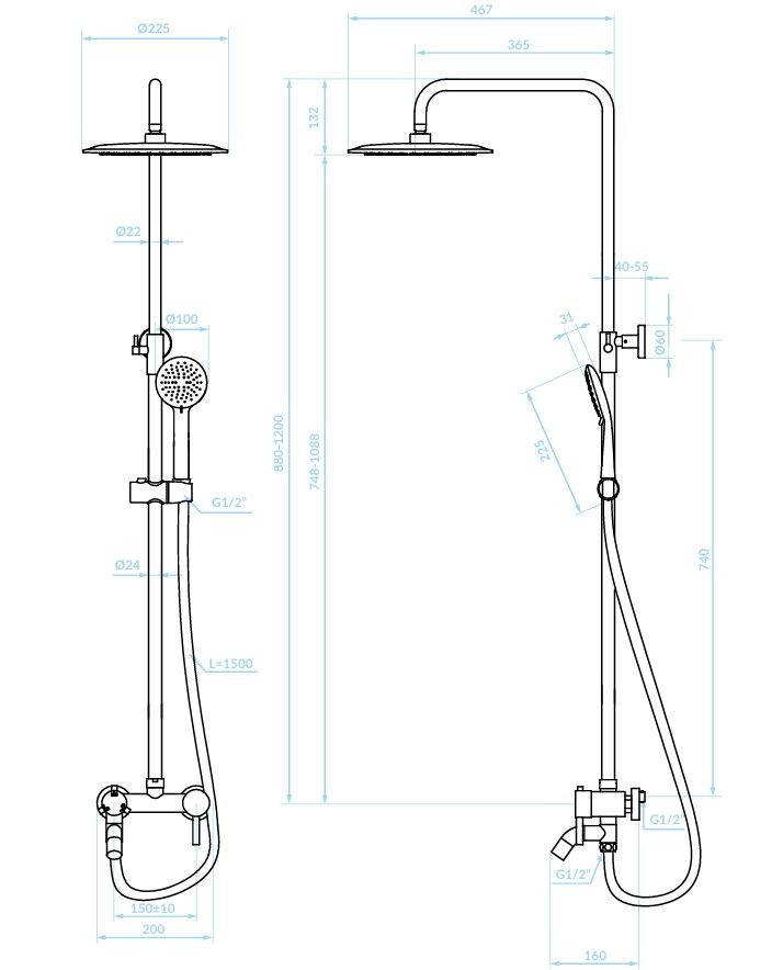 Součástí setu je výškově nastavitelná sprchová hlavice s dešťovým efektem o průměru 225 mm, 3funkční ruční sprcha (déšť, hydromasáž, smíšený proud) a flexibilní hadice s délkou 1500 mm a ochranou proti přetočení. Komfort doplňuje nastavitelný držák ruční sprchy.