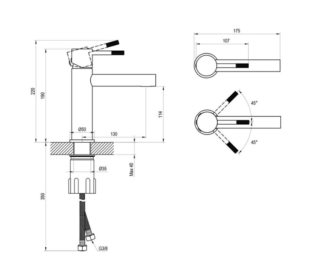 - připojení G 3/8", flexibilní hadičky 450 mm