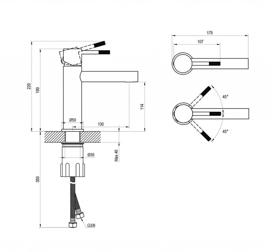 - připojení G 3/8", flexibilní hadičky 450 mm