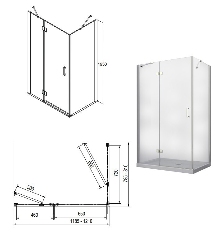 otevírají do prostoru. Spodní hrana dveřní skla je opatřena okapničkou, díky níž voda ze skla při otevření nezteče do prostoru koupelny, ale do vnitřního prostoru koutu. Kout je možné objednat ve třech rozměrech 100 × 80 × 195 cm , 120 × 80 × 195 cm nebo 120 × 90 × 195 cm.