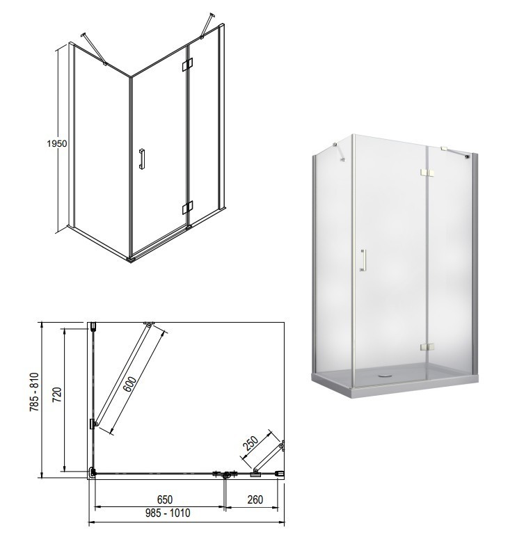 otevírají do prostoru. Spodní hrana dveřní skla je opatřena okapničkou, díky níž voda ze skla při otevření nezteče do prostoru koupelny, ale do vnitřního prostoru koutu. Kout je možné objednat ve třech rozměrech 100 × 80 × 195 cm , 120 × 80 × 195 cm nebo 120 × 90 × 195 cm.
