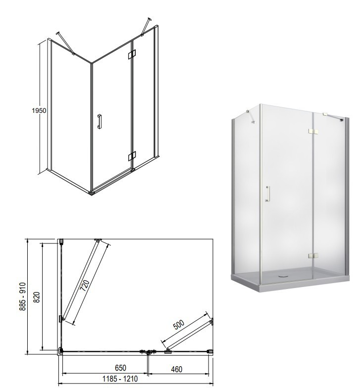 otevírají do prostoru. Spodní hrana dveřní skla je opatřena okapničkou, díky níž voda ze skla při otevření nezteče do prostoru koupelny, ale do vnitřního prostoru koutu. Kout je možné objednat ve třech rozměrech 100 × 80 × 195 cm , 120 × 80 × 195 cm nebo 120 × 90 × 195 cm.