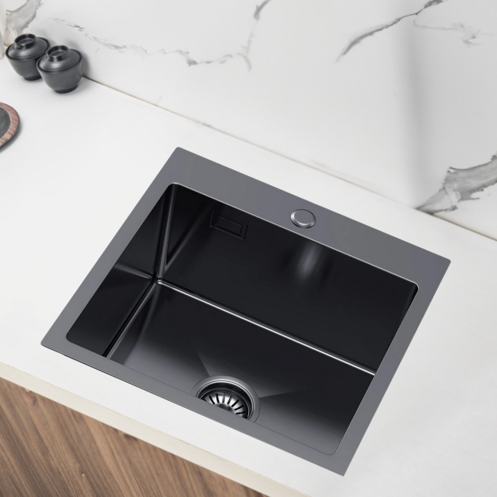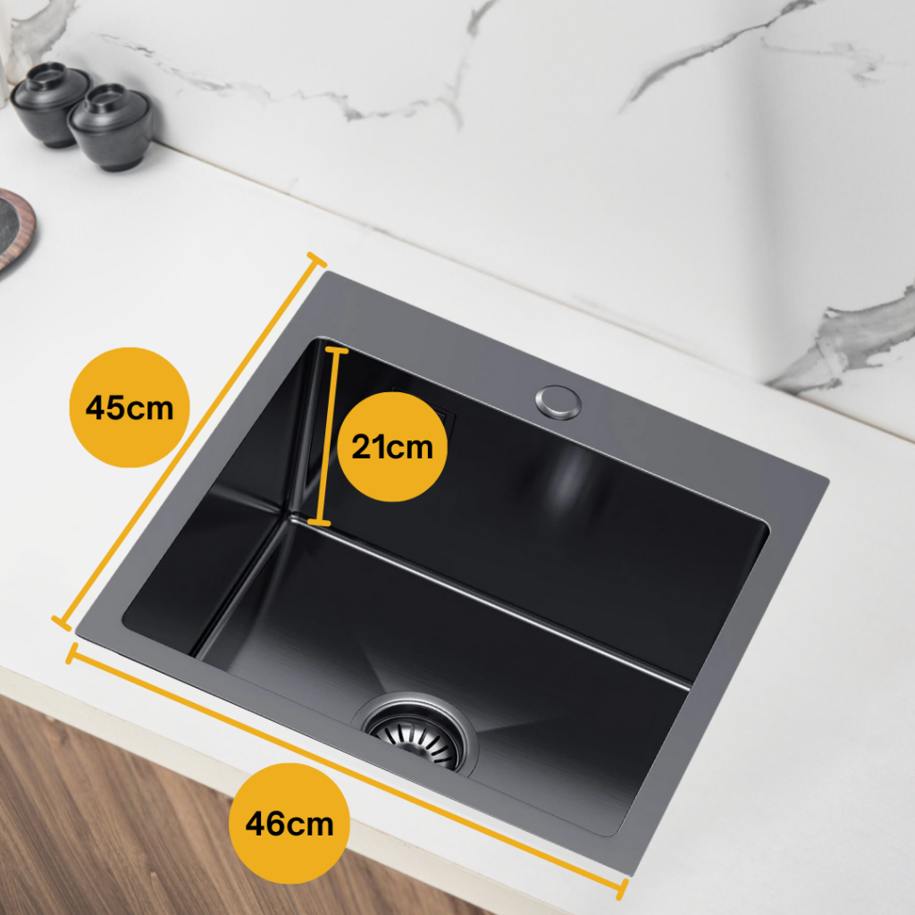 Dřez je v nabídce ve třech elegantních barevných variantách – nerez, zlato a grafit. Díky tomu si snadno vyberete provedení, které nejlépe ladí s vaší kuchyní, armaturami nebo spotřebiči. Každý odstín dodá kuchyňské lince jiný charakter – nerez pro klasický vzhled, zlato pro luxusní nádech a grafit pro moderní, industriální styl.