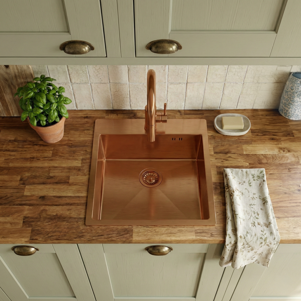 Ocelový dřez Leo 40 v provedení broušená měď spojuje moderní design a praktičnost, díky čemuž se skvěle hodí do každé kuchyně. Je vyroben z vysoce kvalitní nerezové oceli AISI 304 (tloušťka 2 mm) a vyniká vysokou odolností proti korozi, poškrábání i vysokým teplotám, takže zůstává dlouhodobě odolný a spolehlivý. Hluboká, prostorná vana zajišťuje pohodlí při každodenním používání.Dřez je vybaven otvorem pro baterii, což umožňuje rychlou a snadnou montáž armatury. Produkt má odtok barevně sladěný s povrchovou úpravou, díky čemuž celek působí jednotně a elegantně.Hygienický povrch a snadné čištění hladkých prvků pomáhají udržet dřez v bezvadném stavu a omezují možnost rozvoje mikroorganismů.Produkt je dostupný ve dvou variantách: bez baterie nebo v setu s kuchyňskou baterií Fresh s vytahovací výpustí.