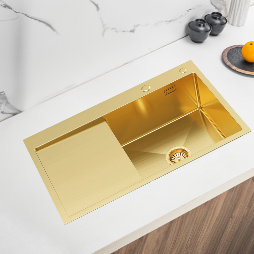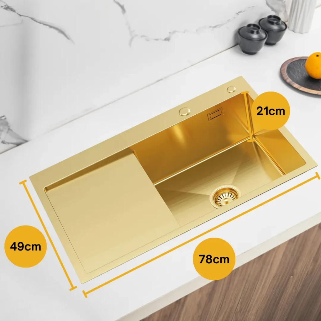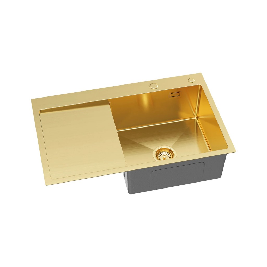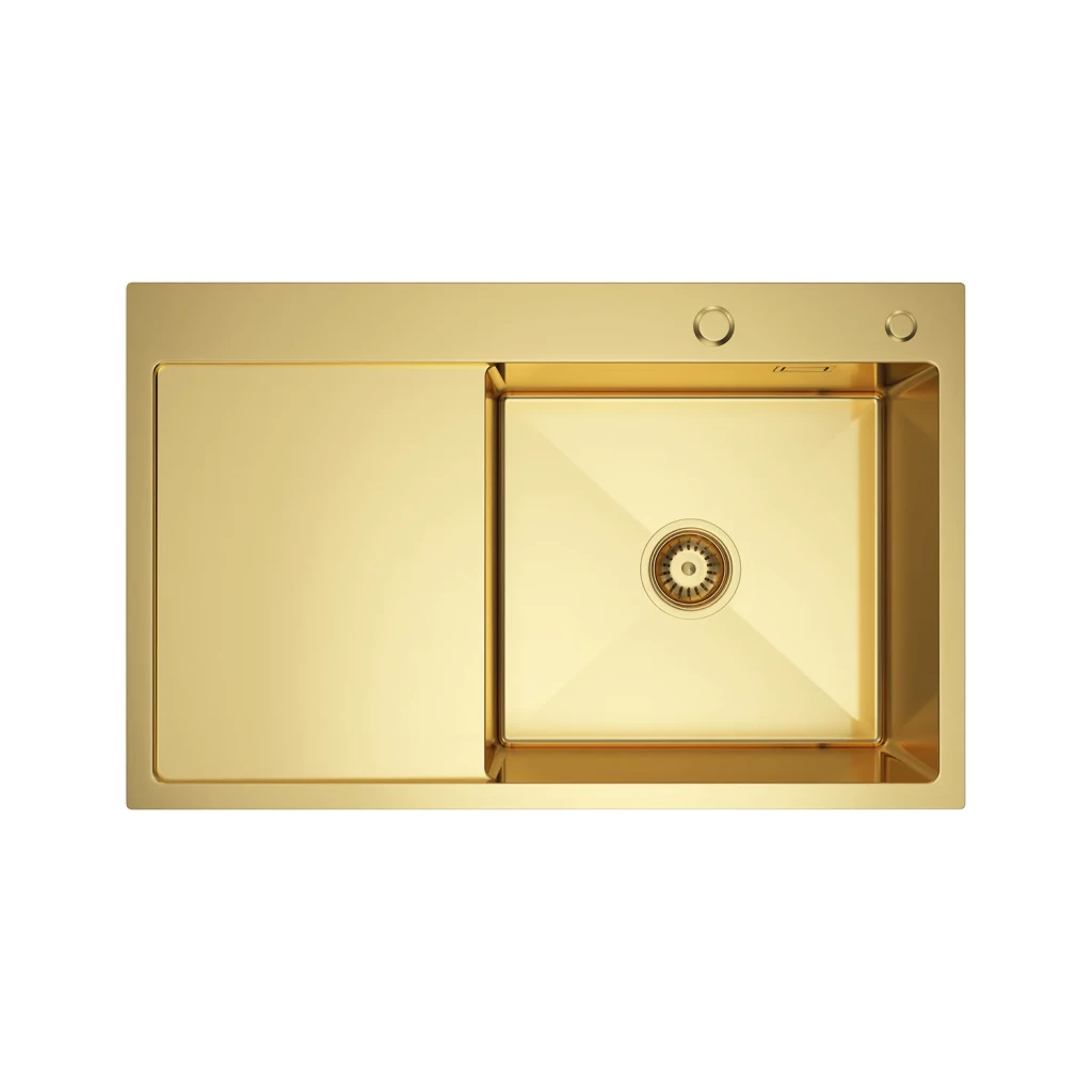 Dřez je v nabídce ve třech elegantních barevných variantách – nerez, zlato a grafit. Díky tomu si snadno vyberete provedení, které nejlépe ladí s vaší kuchyní, armaturami nebo spotřebiči. Každý odstín dodá kuchyňské lince jiný charakter – nerez pro klasický vzhled, zlato pro luxusní nádech a grafit pro moderní, industriální styl.