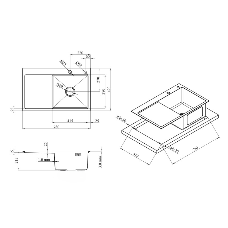 - rozměry dřezu: 780 × 490 × 210 mm