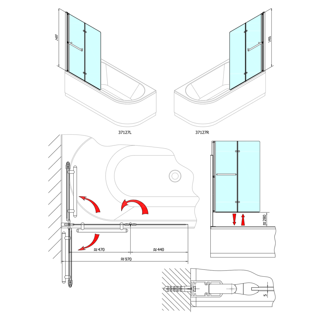 Integrované pneumatické písty umožňují zdvihnutí zástěny o 28 cm a její následné sklopení na zeď, například nad vanovou baterii. Jedná se o řešení, které nabízí snadnou údržbu a přístup k vaně. Díky přítlačnému pístu je zajištěna ochrana proti rozstřiku vody.