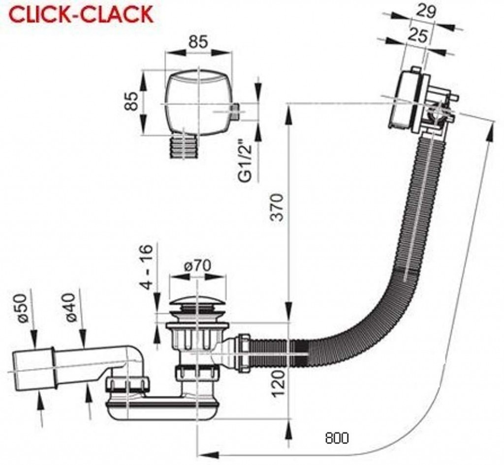 Odtokový komplet s napouštěním přepadem je instalován v případě použití vanové podomítkové baterie. Voda natéká přepadem vany a regulace probíhá přes podomítkovou baterii. Vyrobeny jsou z nejkvalitnějších materiálů a liší se délkou, mechanismem a designovým řešením. Pomocí ClickClack mechanismu stlačením/sešlápnutím odtokovou zátku zavřete a opětovným stlačením/sešlápnutím opět otevřete. Ovládání odtoku je hranaté s povrchovou úpravou chrom.